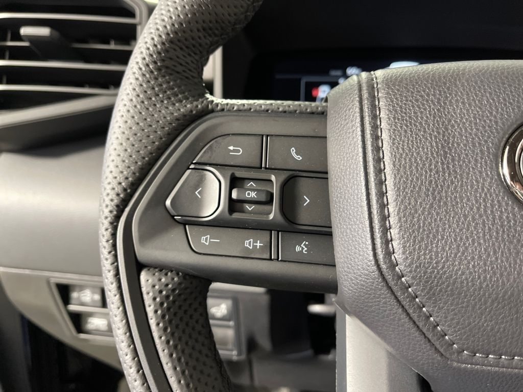 - Trd leather-wrapped manual tilt/telescopic steering wheel with trd badge, red center stripe, and phone, audio, display/infotainment, and driver assist controls.